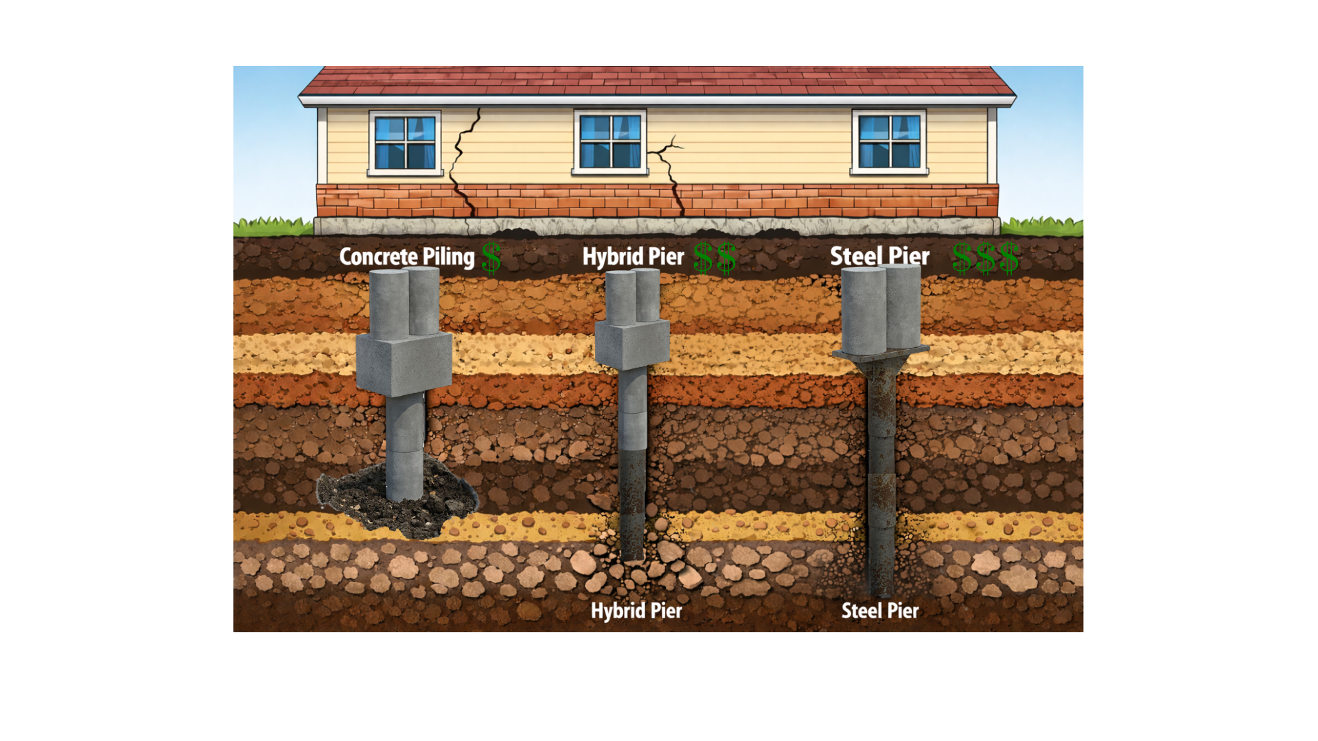 Hybrid piers combine steel for the upper portion (first ~5 feet) with concrete piling below, allowing better penetration through unstable surface soils.